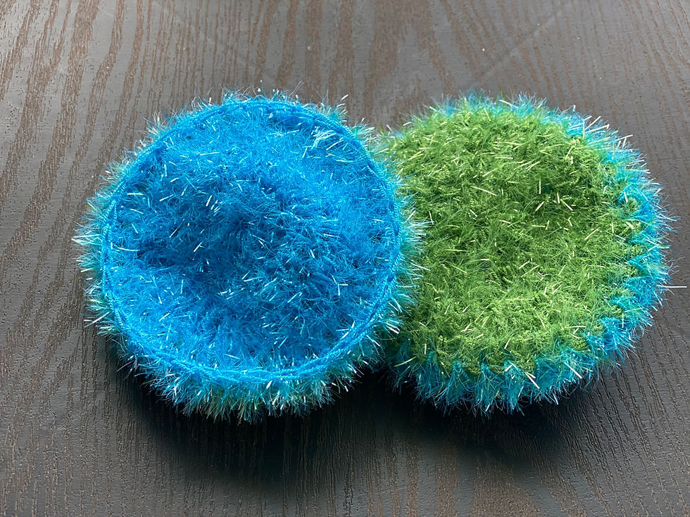 These dish scrubbies are made with Red Heart Scrubby Sparkle yarn. They are double-layered and measure approximately 4" in diameter. They come in a pack of two for $5/pack.